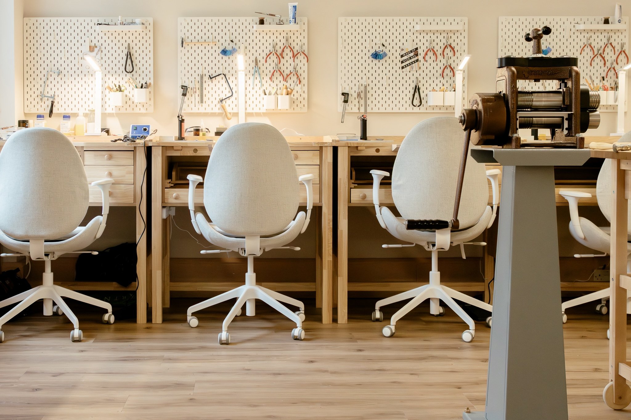 Your own dedicated professional Durston Jewellers Bench with pegboard and locker space in our state-of-the-art shared studio space. Use of shared tools including a beautiful rolling mill, large bench vice, central workbench, polishing barrel, pickle pot and ultrasonic cleaner.